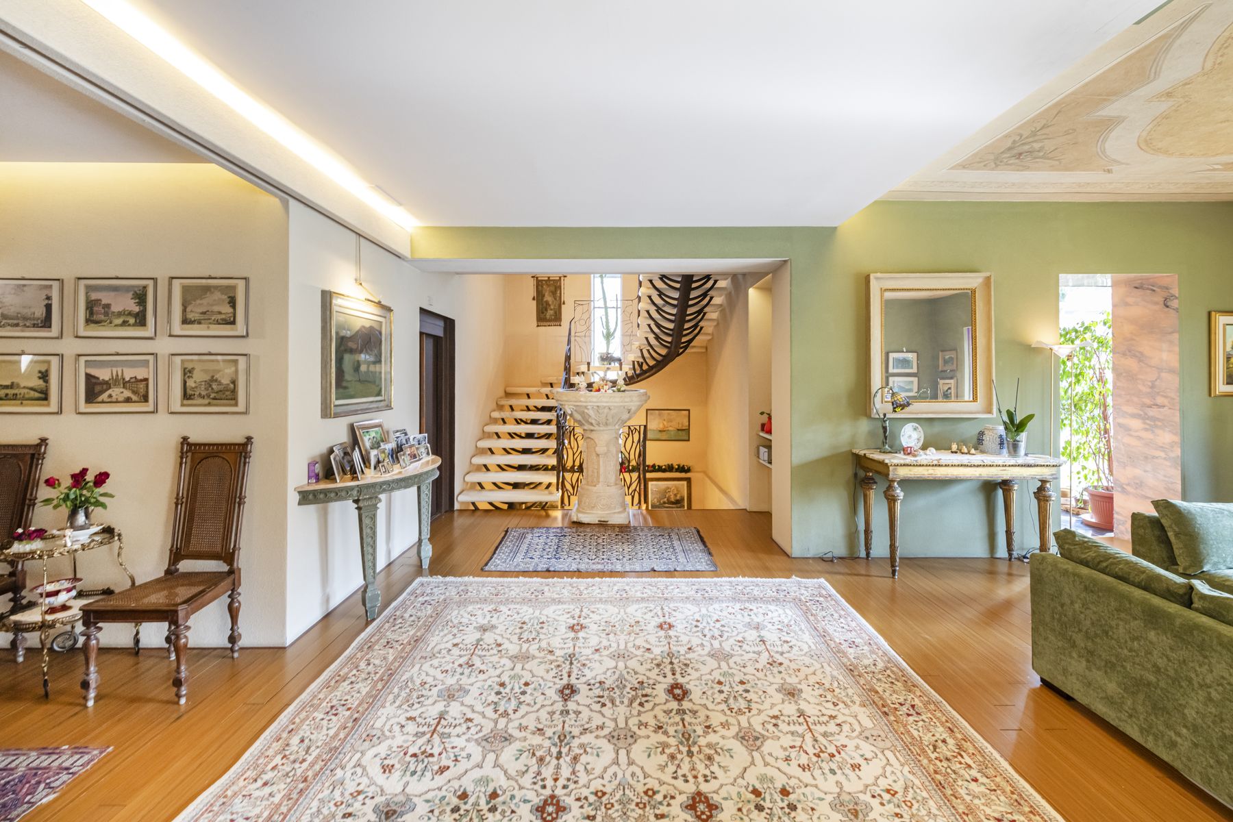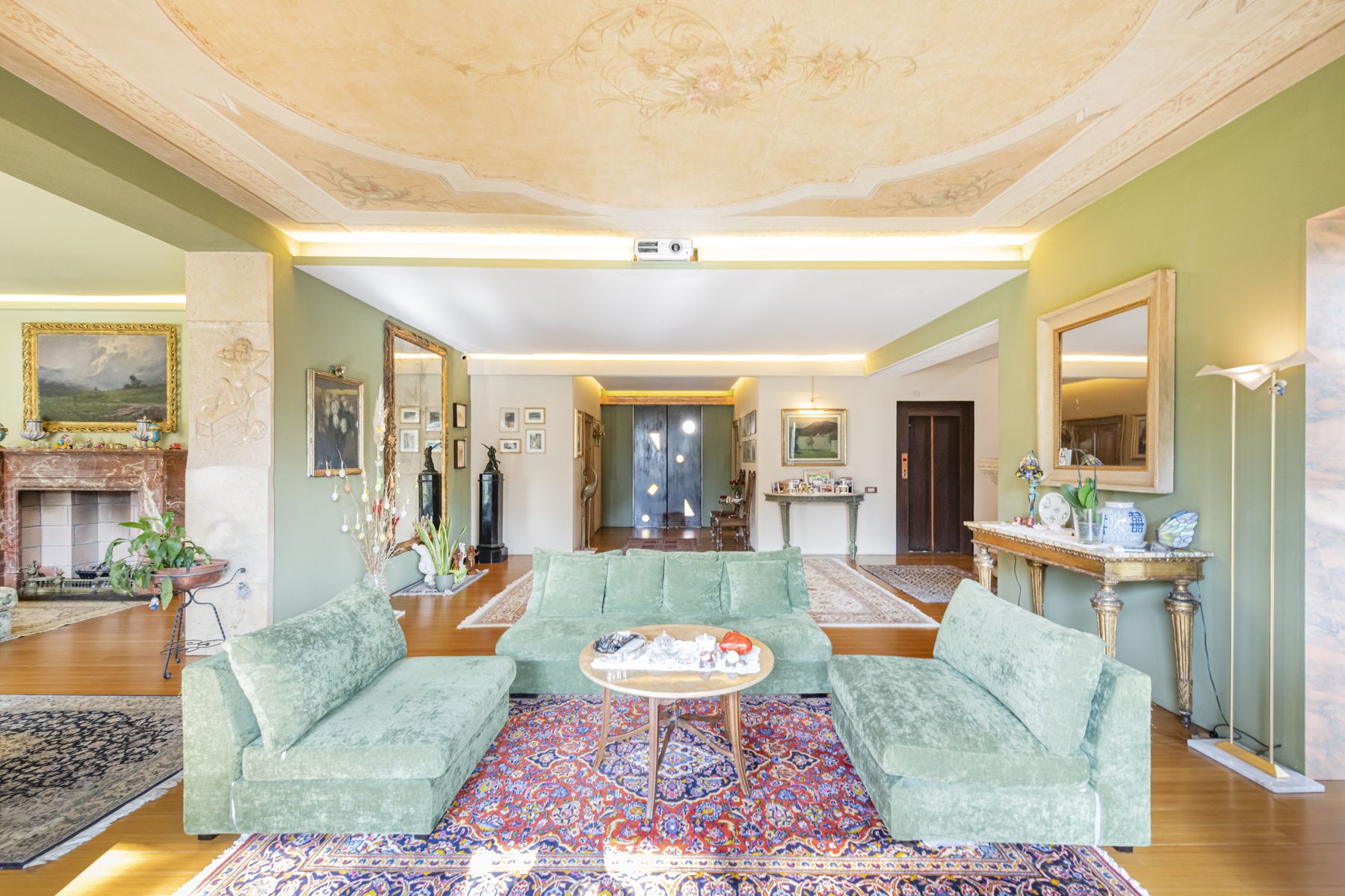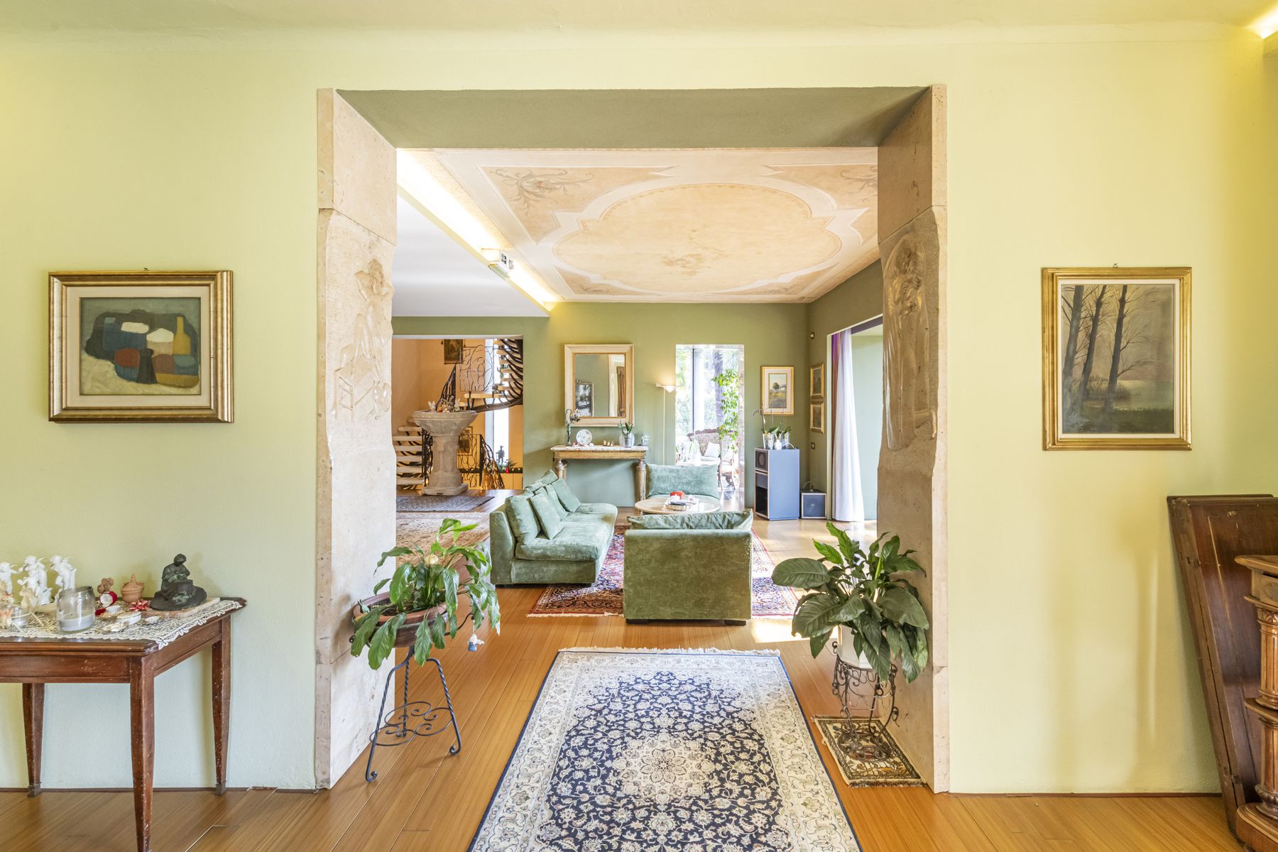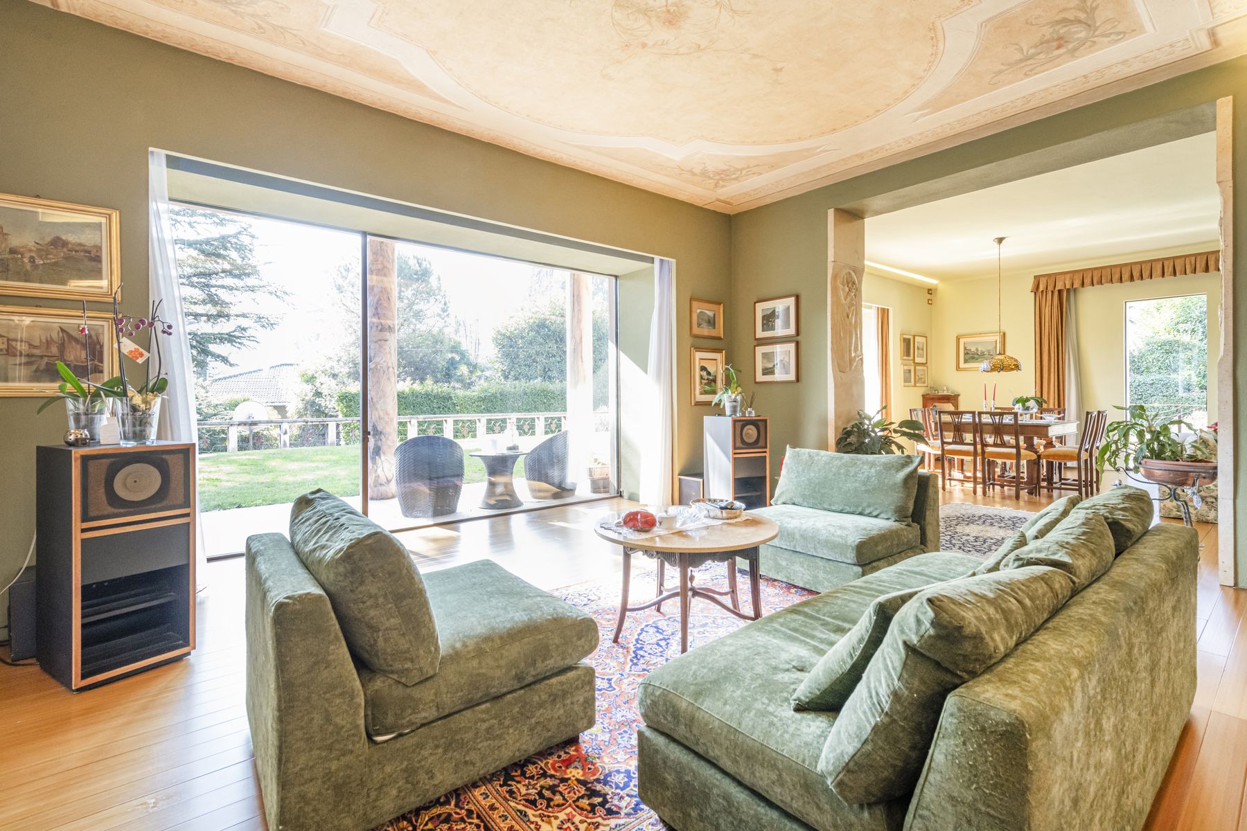 Spacious living room with original frescoed ceilings and open-plan dining area