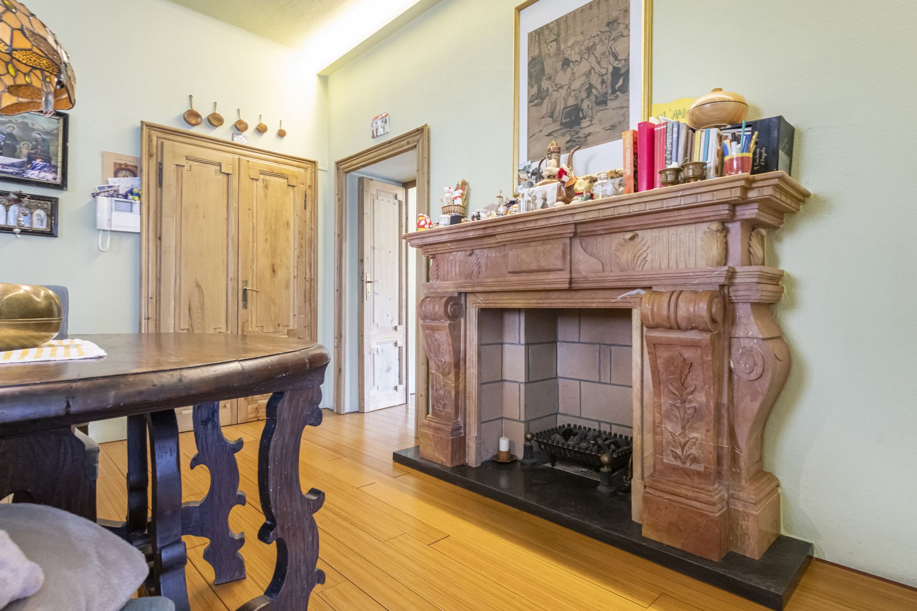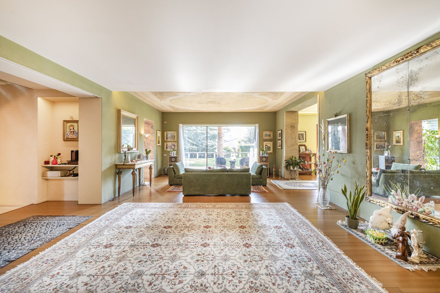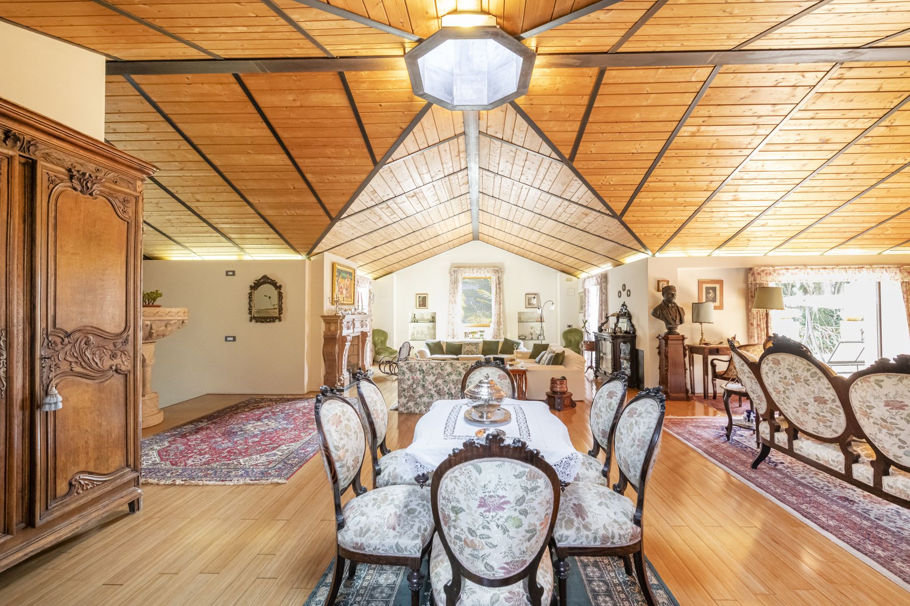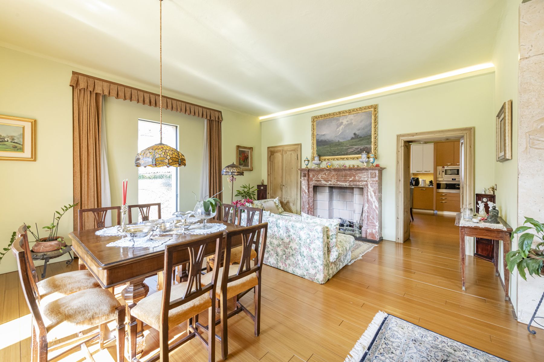 Spacious living room with original frescoed ceilings and open-plan dining area