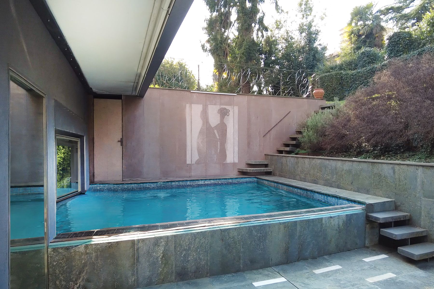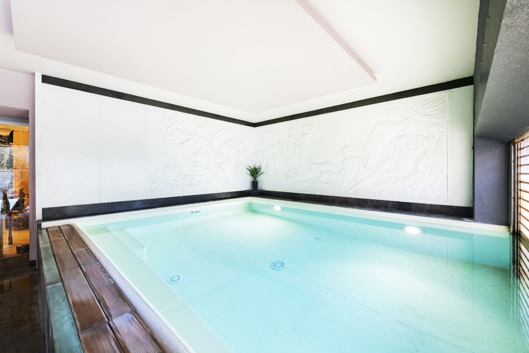 Indoor swimming pool connected to the outdoor swimming pool (10 x 4 meters) opening onto a private sunken solarium courtyard, designed to guarantee maximum privacy