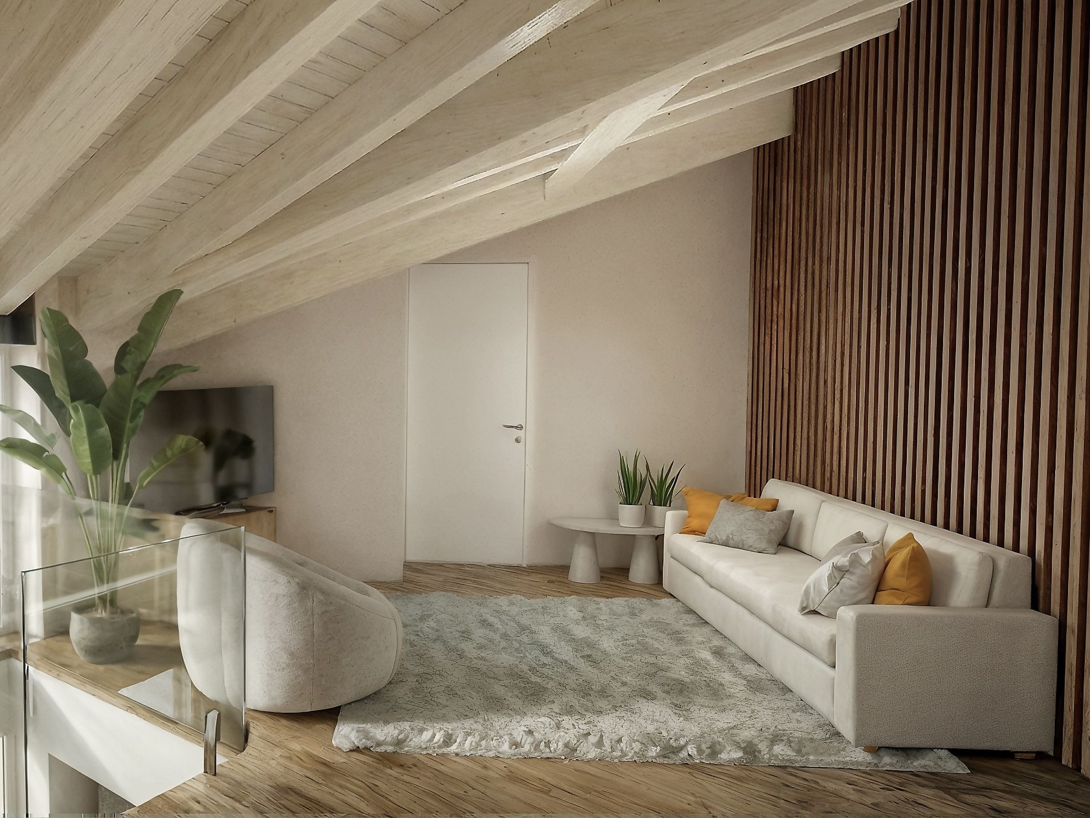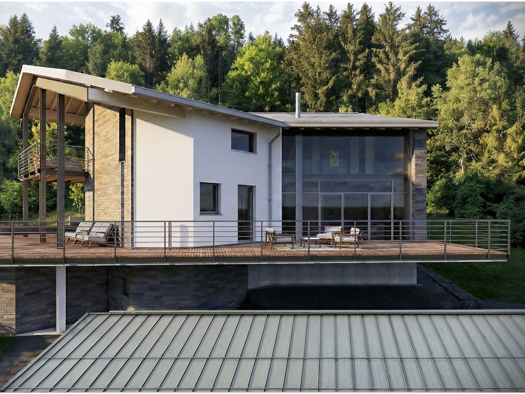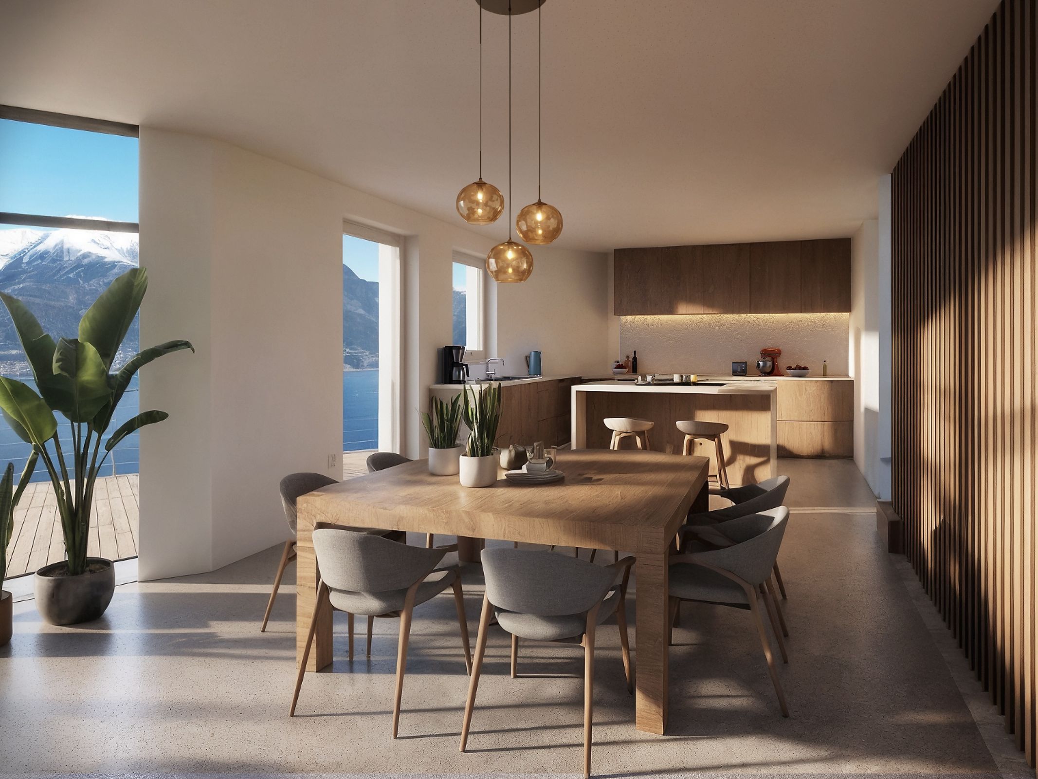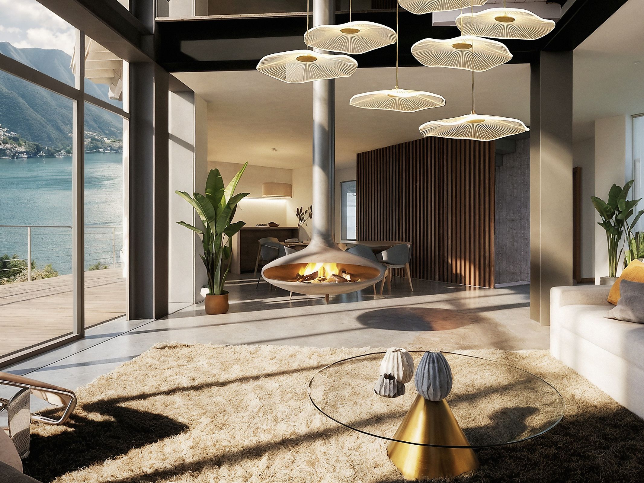 The ground floor (115 sqm) features a large living area with double-height ceiling, perfect for a suspended designer fireplace, a kitchen and dining area, large panoramic windows overlooking the lake, a study or bedroom and a bathroom.
